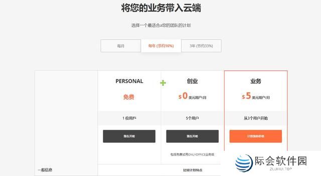 5、当然,对于用户或者小型工作室可以创建属于自己的ONLYOFFICE云,不过这项功能也不是完全免费的,但好在对于小型工作室来说价格方面还是很友好的。下面是它的不同档位的价格,其实看看相对于别的会员来说已经够实惠了。