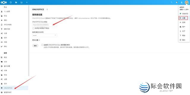 7、完成下载启用后,还是在右上角头像处点击设置,并选择ONLYOFFICE,在服务器设置出输入群晖的地址以及刚刚设置好的本地端口,这样就可以直接完成连接啦。
