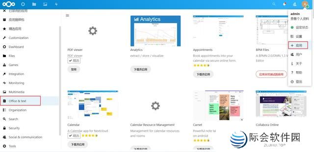 6、等待安装完毕,进入nextcloud的页面,在右上角的头像处点击并选择应用,在左侧找到office%text,并选择ONLYOFFICE下载并启动。